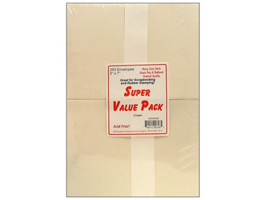 Paper Accents Super Value Pack Envelopes are perfect for greeting cards, invitations, letters, and more. Let someone know that they have received something special before it's even opened. These envelopes are acid-free, lignin-free, buffered and archival quality. Pointed Flap. A7. For use with 5 x 7 inch cards. Actual envelope size: 5 1/4 x 7 1/4 inch. Cream 250 pc.