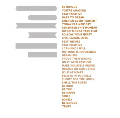 Create labels with the perfect sentiment with this stamp and die set. Includes 6 labels and sentiments 'Be Unique', 'Do It With Passion', 'Good Things Take Time', 'Dream Big' and many more.