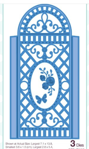 Designed by Jamie Rodgers this set contains a trellis, roses and a butterfly perfect for cards and other paper craft projects. This die set can be mixed and matched with other dies in the range or used on its own. The dies are compatible with most home die cutting machines. Three die set, Size largest 7.1 x 13.8 cm, smallest 3.6 x 1.5 cm.