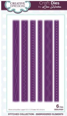 This set of dies designed by Lisa Horton will cut embroidered borders that will add an interesting edge to any project. Includes 6 dies. Size: (Largest) 6.4 x 0.5in (Smallest) 6.4 x 0.2in.