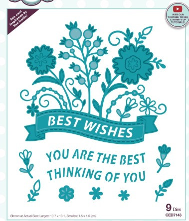 These dies will cut and emboss a wonderful card front, the floral banner and greetings will bring joy to all that sees it. Try mixing and matching with other dies in the range. The pack contains project inspiration to get the creative juices flowing. The dies are compatible with most home die cutting machines. Largest Die size 10.7 x 13.1 cm Smallest 1.5 x 1.5 cm. Nine die set.