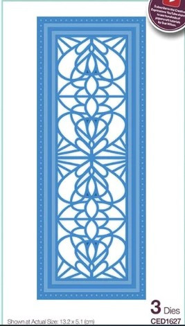 This striplet set comes in three die pieces, a decorative inner die with two outer cutting edges which will allow you to create a raised frame for your project. Would look great with a mixed media background behind...think pixie powders, polish, wax or glitter!