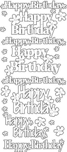 A sticker sheet that says "Happy Birthday" in a variety of sizes and formats. Includes several flower stickers as well for additional decoration.