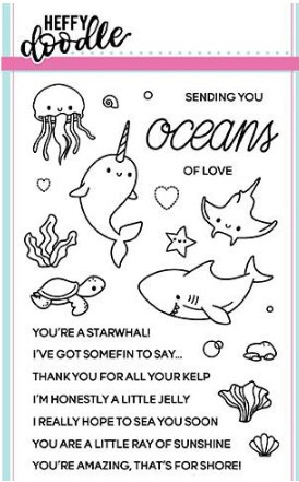 A set of 26 stamps with cute sea critters including a narwhal, starfish, manta ray, shark, jellyfish and turtle. The set also includes a selection of scene building elements such as seaweed, shells, rocks, kelp and bubbles along with a number of puntastic sentiments. Coordinates with HFD 0043 Oceans Of Love dies.