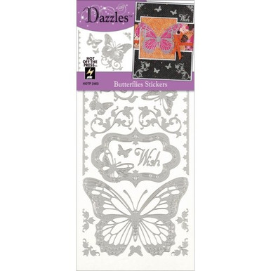 Butterflies Dazzles! These elegant silver Butterflies Dazzles by Hot Off The Press feature 24 pieces, including: borders, butterflies, flourishes, a frame and the word "Wish". These lovely Dazzles come on a 4"x9" sheet and are the perfect addition to any project! Try them on scrapbook pages, card making and much more! With these Dazzles you get the look of a heat-embossed image--but all you do is peel and stick! Even better, your Dazzles come packaged with an idea sheet showing a finished card idea and additional tips.