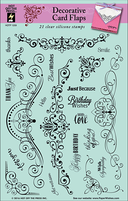 21 borders, flourishes and phrases! This 6";x8" sheet of clear silicone stamps from Hot Off The Press features decorative borders to lend a unique touch to your card and envelope flaps with delightful greetings and sentiments to further personalize all of your creations! Included are ideas and inspiration to get you started!