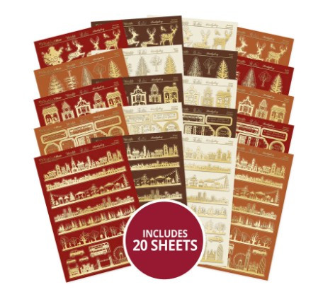 Build sensational scenes with the Christmas Village Elegance Topper Collection. Our award-winning range of Adorable Scorable has been intricately foiled in Rich Gold with detailed elements which have then been expertly die-cut ready for you to press out of the heavyweight sheets and arrange however you wish. Create stunning landscapes featuring snow capped trees, Santa and his reindeer flying through the snowy sky, city skylines, a Christmas market and street scenes with houses and a host of people characters who cabe mixed and matched to represent the lucky recipients of your makes. We've also included a selection of seasonal sentiments to truly personalize your cards.