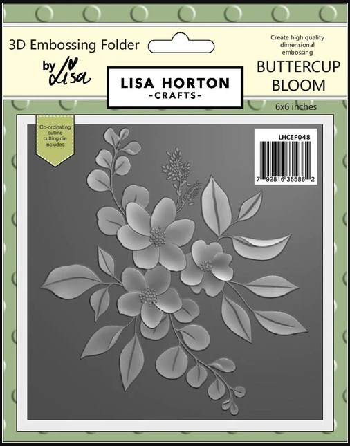 Buttercup Bloom 6x6 3D Embossing Folder With Cutting DieThis amazing high quality 3D Embossing Folder with very detailed Buttercup Bloom artwork includes a separate coordinating outline cutting die. Perfect for your cards and projects. Embossing Folders produce a deep and intricate embossed effect with different levels of embossing for even more visual interest and then can be embellished with ink, paint or other mediums. Simply cut your card with the die, then place inside the folder and emboss. Each design is highly detailed with so many layers, your image looks incredible with just a pass through your machine. Includes one 6 x 6 inch 3D Embossing Folder and one outline cutting die. Size - 152mm x 152mm. Designed by Lisa Horton.