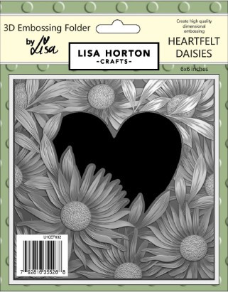 Lisa Horton Crafts 6x6 3D Embossing Folder - Heartfelt DaisiesThis amazing high quality 6x6 3D Embossing Folder set has a heart frame surrounded by beautiful daisies. Perfect for your cards and projects. Embossing Folders produce a deep and intricate embossed effect with different levels of embossing for even more visual interest and then can be embellished with ink, paint or other mediums. Includes 6 x 6 inch 3D Embossing Folder. Size - 152mm x 152mm.