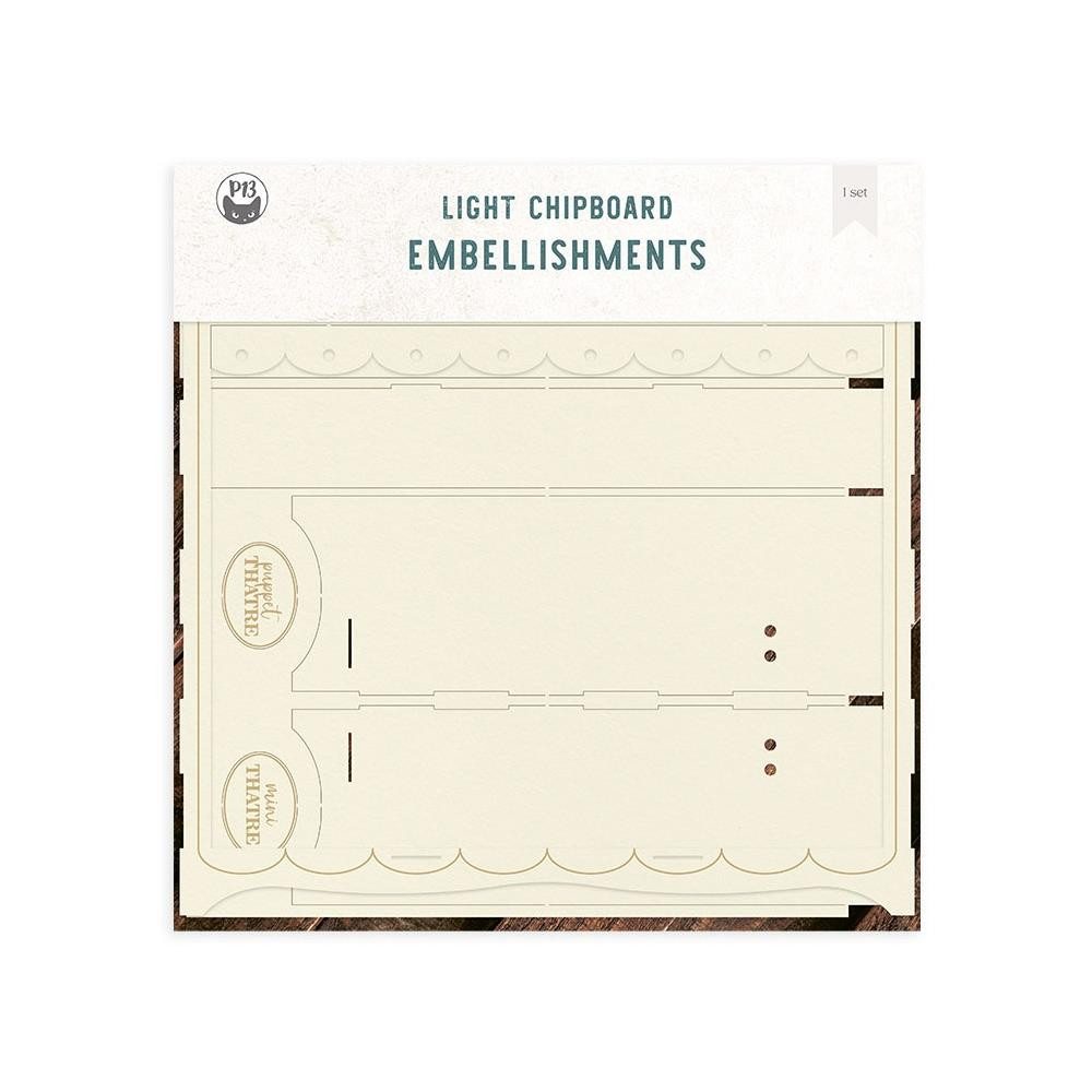 - Mini Theatre, 1.55 mm thick. Size of the set is 12 x 12. A pack includes 6 pieces needed to put the mini theatre and 2 inscriptions that can be used to decorate it. Light chipboard can be colored using paints, inks, heat embossing or by applying waxes and structural pastes.